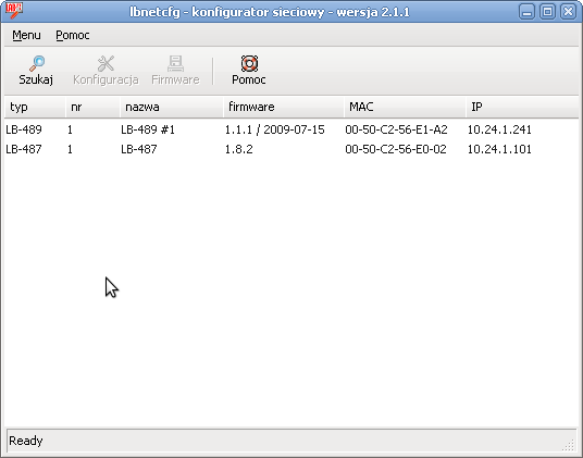 Po uruchomieniu programu należy wydać polecenie Szukaj, w efekcie czego program wyświetli w postaci listy wszystkie znalezione urządzenia w lokalnym segmencie sieci, obsługujące odpowiedni protokół konfiguracyjny: