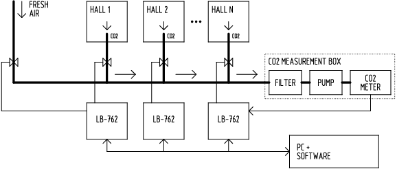 Connecting individual CO2 meters is relatively costly, the application of collective measurement permits reduction in installation costs. Figure 1.6, “Scheme of a collective system of CO2 concentration measurement” presents the scheme of a typical installation of collective CO2 measurement. The system consists of the following elements: