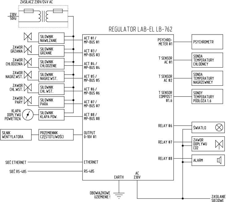 Regulator LB-762 służy do sterowania pojedynczą halą uprawy pieczarek. Zapewnia on wszystkie niezbędne pomiary oraz sterowanie odpowiednimi urządzeniami wykonawczymi w celu zapewnienia optymalnych warunków klimatycznych do uprawy grzybów.