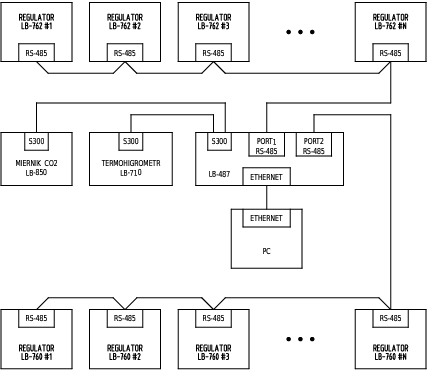 Sieć RS-485 wymaga zastosowania modułu LB-480, który działa jako konwerter interfejsów komunikacyjnych. Połączenie pomiędzy komputerem PC a modułem LB-480 realizowane jest za pomocą sieci Ethernet. Moduł LB-480 komunikuje się z regulatorami za pomocą sieci RS-485. Dodatkowo do modułu LB-480 dołączone mogą być wspólne urządzenia systemowe - jak zewnętrzny termohigrometr i miernik stężenia CO2.
