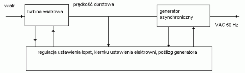 Energia elektryczna produkowana w takich elektrowniach wiatrowych musi mieć takie same parametry (częstotliwość i napięcie) jak sieć, z którą współpracuje. Zwykle prędkość obrotowa turbiny utrzymywana jest na stałym poziomie, ale stosowane są też układy pracujące ze zmienną skokowo prędkością obrotową. Dla zwiększenia rocznej produkcji energii stosowane są generatory o przełączanej (regulowanej dwu rzadziej trzy stopniowo) liczbie par biegunów. Daje to możliwość pracy przy różnych prędkościach obrotowych generatora. Mogą tez być stosowane dwa oddzielne generatory, z których jeden pracuje przy dużych prędkościach wiatru, zaś drugi przy słabszych wiatrach.