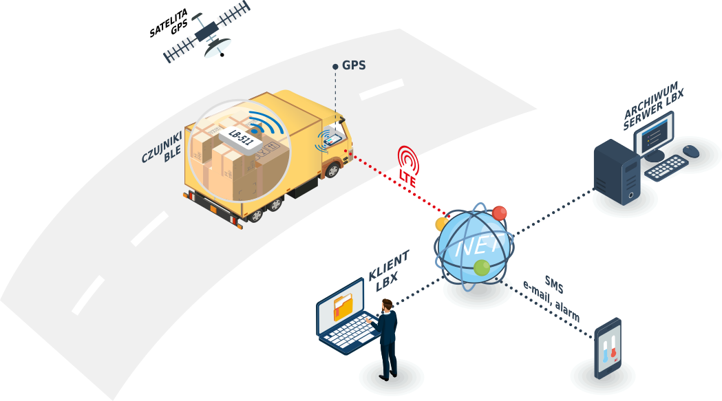 • umożliwia ciągłe przesyłanie przez siec telefonii komórkowej GSM danych pomiarowych do nadrzędnego systemu kontroli transportu opartego o program Serwer LBX pracującego pod kontrolą systemu Windows,